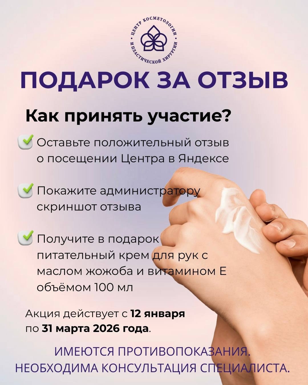 Получите в подарок питательный крем для рук с маслом жожоба и витамином Е объёмом 100 мл.